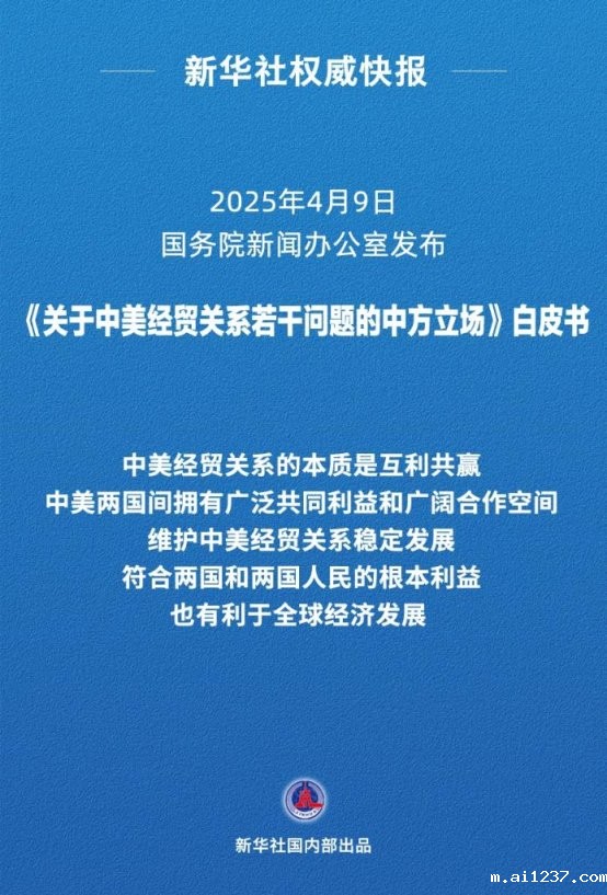 新华社北京4月9日电(记者谢希瑶、王雨萧)国务院新闻办公室9日发布《关于中美经贸关系若干问题的中方立场》白皮书,澄清中美经贸关系事实,阐明中方对相关问题的政策立场。